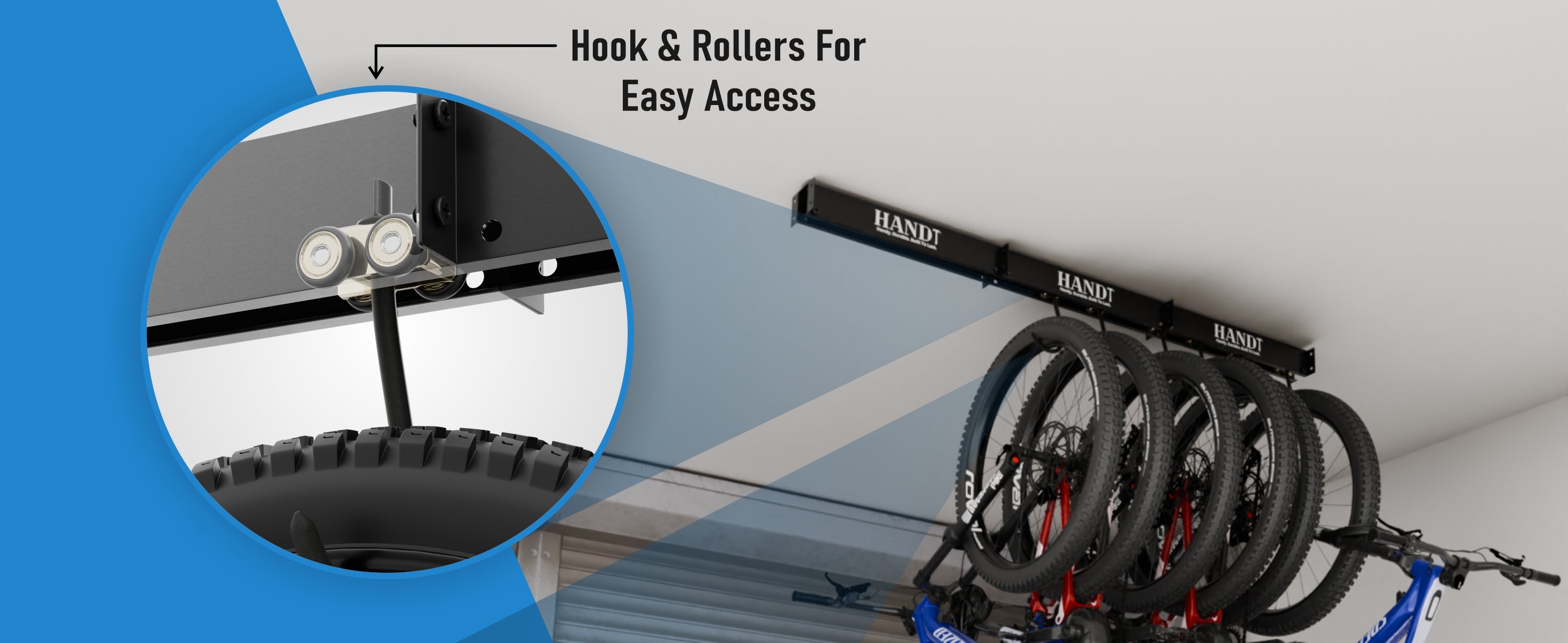 - Sliding Storage Design - The sliding bike hanger ceiling design of the garage bike rack ceiling mount allows for easy access to your hanging bike rack garage ceiling mount