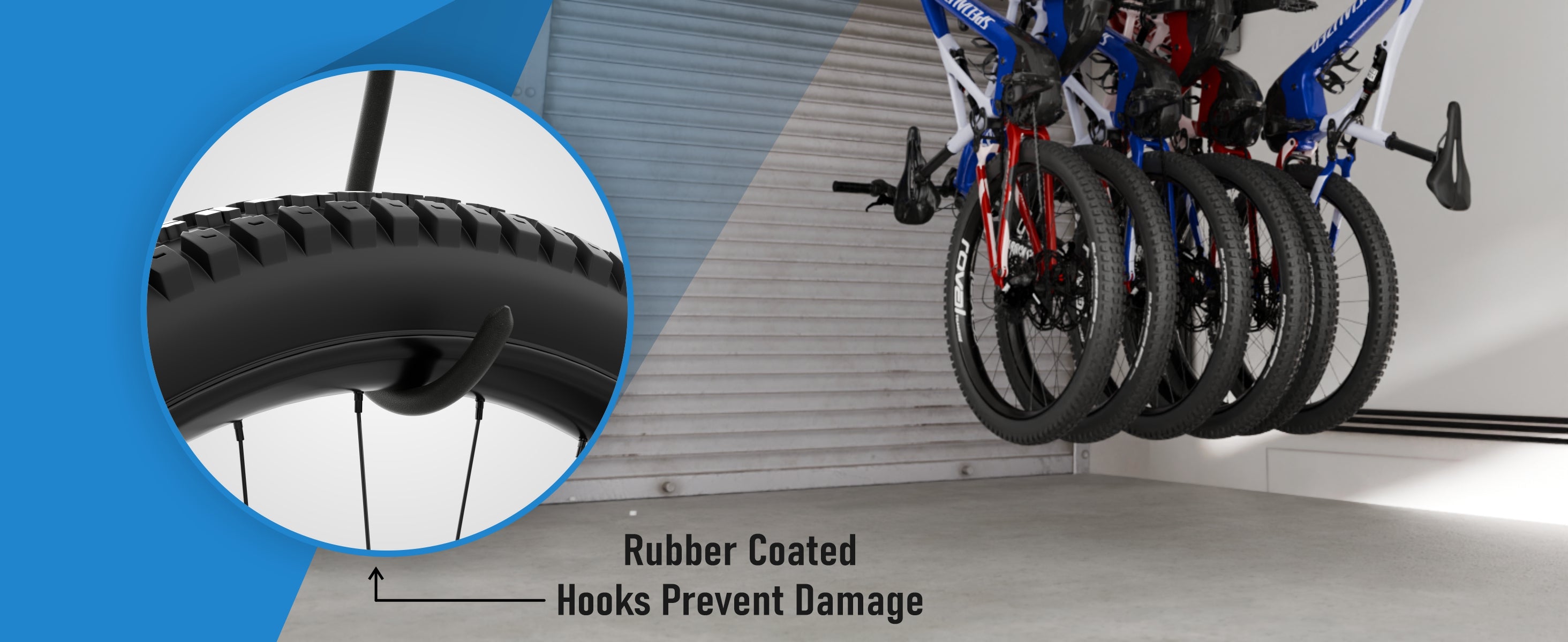 - Heavy Duty Quality - The bicycle ceiling hanger has a rubber coating over the bike hooks for garage ceiling rack so the bicycle lift for garage ceiling doesn't damage the bikes
